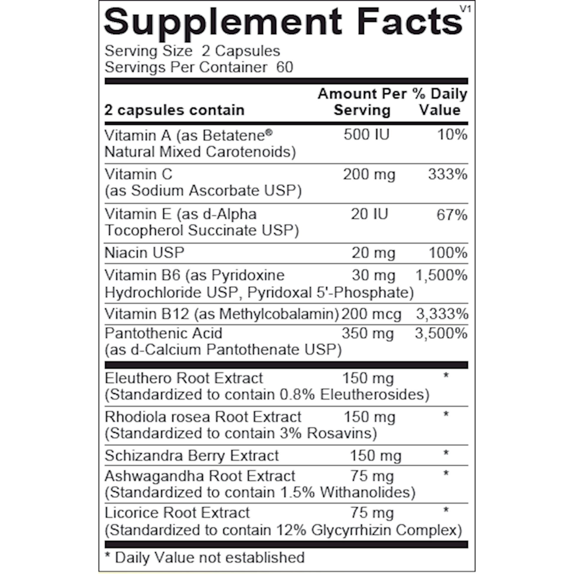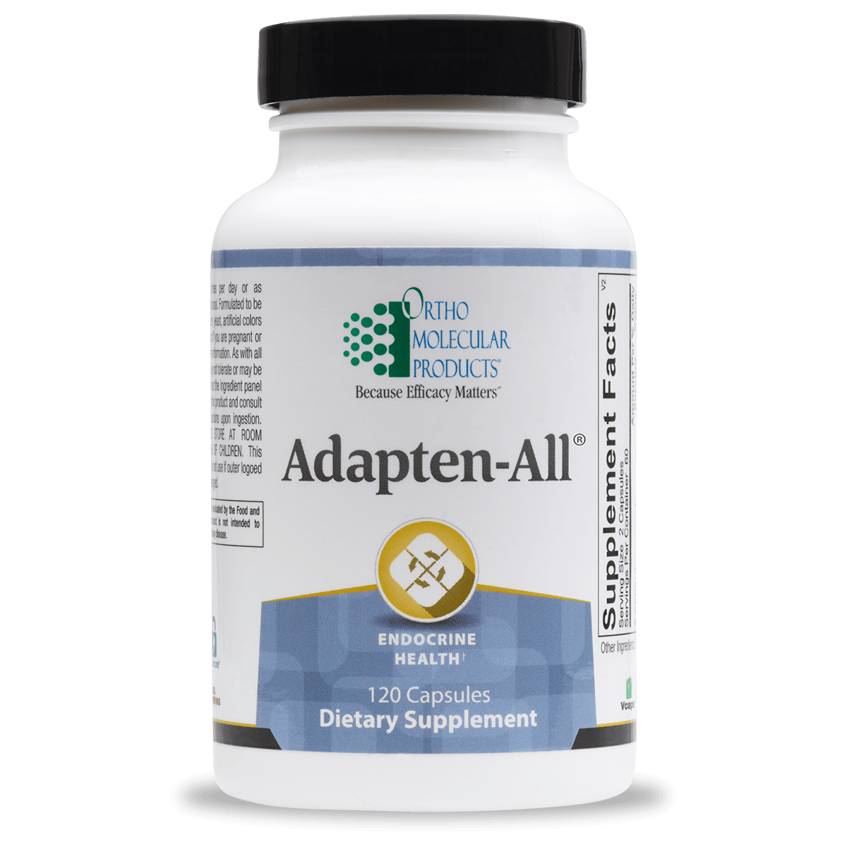 Adapten-All includes a blend of key micronutrients and adaptogenic botanicals specifically formulated to strengthen the body’s stress response and support healthy energy levels. Adapten-All provides targeted amounts of vitamin C, pantothenic acid and other B vitamins that are critical to adrenal gland function. Adapten-All also provides a unique blend of "stress adapting botanicals" which help increase the body’s resistance to fatigue and maintain balanced cortisol and DHEA levels.