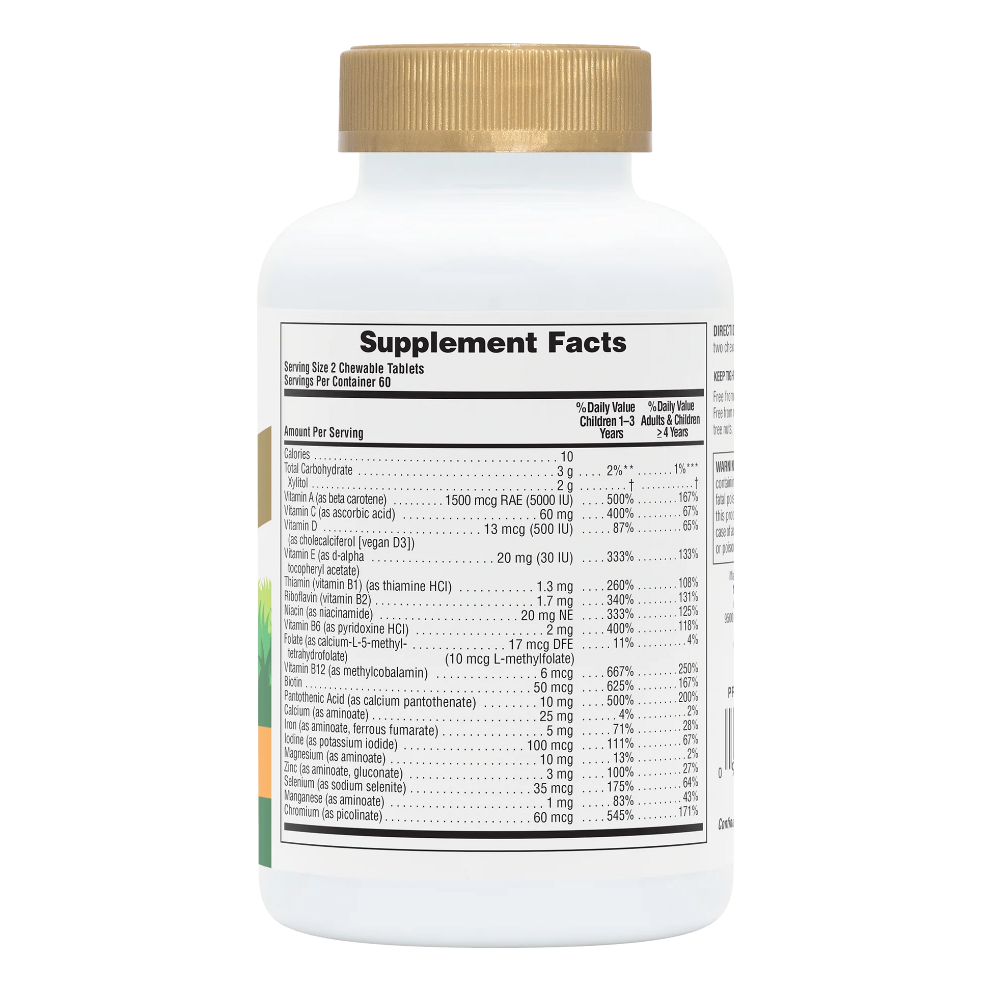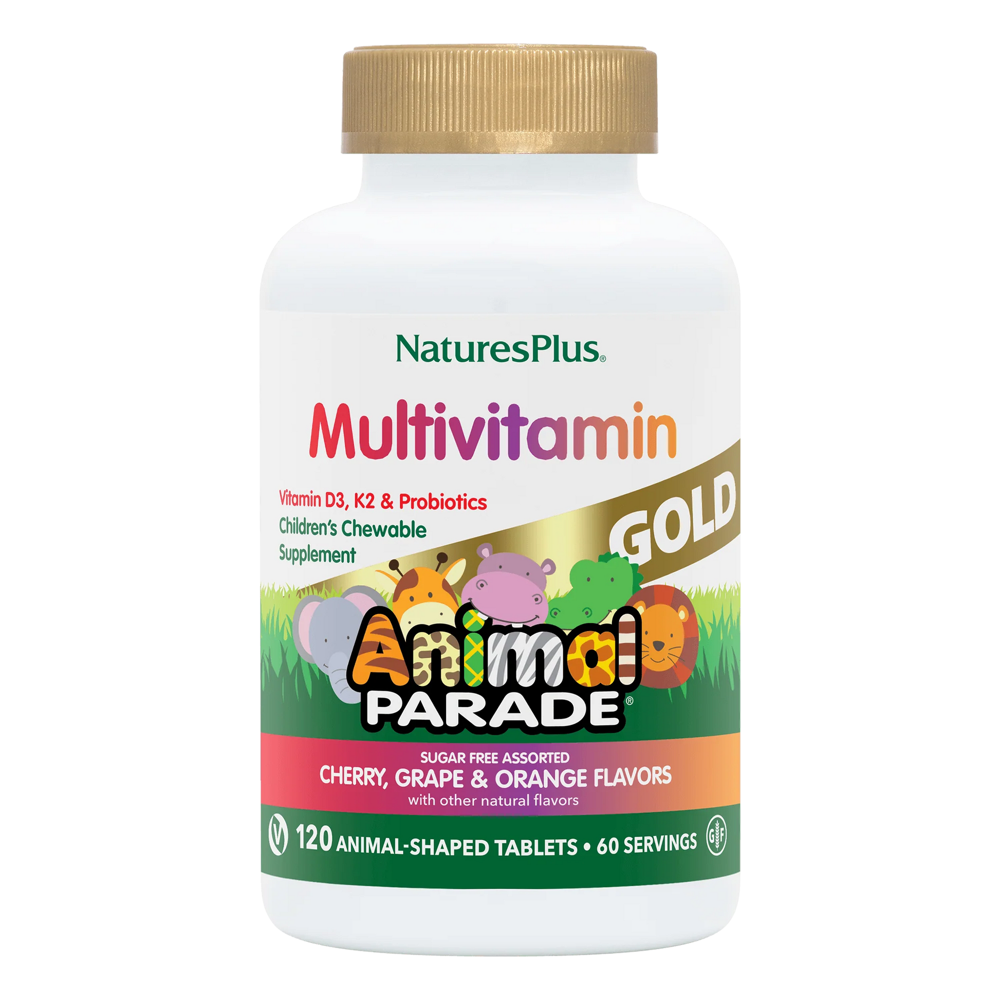 with Vitamin D3, Vitamin K2, Probiotics and Organic Gold Standard Whole Foods Animal Parade® GOLD Multi Children's Chewable takes this best-selling multi-vitamin and mineral formula to the next level! The award-winning taste continues in an irresistibly delicious sugar-free formula, bursting with natural cherry, orange and grape flavors! Each serving of these fun, animal-shaped chewables is now packed with 500 IU of vitamin D3, more trace minerals, enzymes, probiotics, and an extensive assortment of organic whole foods. Animal Parade GOLD is sweetened with xylitol, which may reduce the risk of tooth decay.