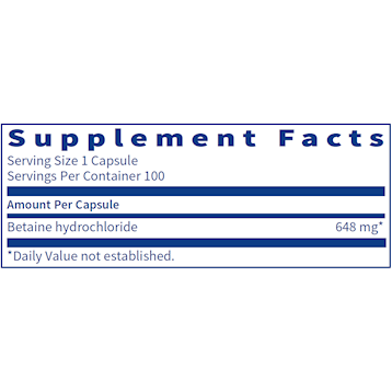 Betaine hydrochloride is a source of hydrochloric acid, which promotes optimal gastric acidity to support protein digestion and absorption of minerals and other nutrients* This compound provides a supplemental source of hydrochloric acid, an acidifying compound normally produced by the stomach during digestion of foods. This product should only be taken by people who have reduced levels of stomach acid. Each 648 mg capsule is equivalent to a measurement of 10 grains.