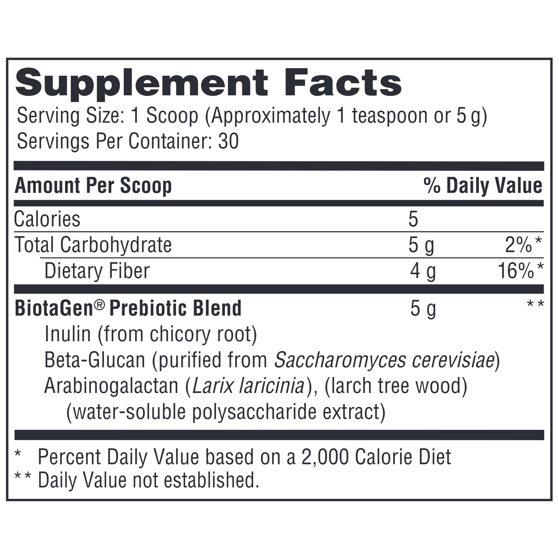 BiotaGen® is a distinctive formulation of soluble dietary fiber with prebiotic activities that stimulates growth of colonic populations of beneficial bacteria and supportsgastrointestinal and systemic immune function.* BiotaGen® combines chicory inulin with larch arabinogalactan and purified yeast beta-glucan.*