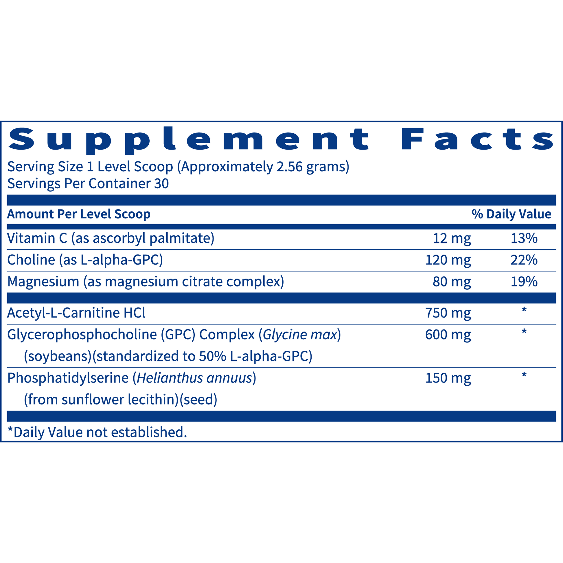 Two rounded scoops of Brain Vibrance Supreme™ Powder supply 300 mg of elemental phosphatidylserine, 1,200 mg elemental glycerophosphocholine (GPC), and 1,500 mg acetyl-Lcarnitine HCl—precisely the same doses used in numerous human clinical trials. Provides clinically studied doses in only two servings.