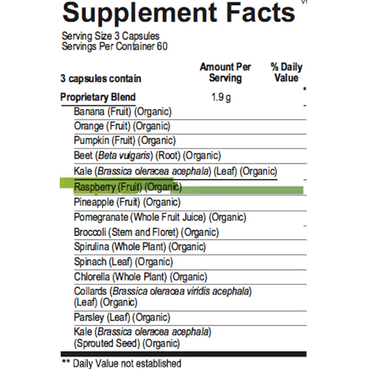 Supplement Facts V1 % Daily Value Proprietary Blend Orange (Fruit) (Organic) Pumpkin (Fruit) (Organic) Beet (Beta vulgaris) (Root) (Organic) Kale (Brassica oleracea acephala) (Leaf) (Organic) Raspberry (Fruit) (Organic) Pineapple (Fruit) (Organic) Pomegranate (Whole Fruit Juice) (Organic) Broccoli (Stem and Floret) (Organic) Spinach (Leaf) (Organic) Chlorella (Whole Plant) (Organic) Collards (Brassica oleracea viridis acephala) (Leaf) (Organic) Parsley (Leaf) (Organic) Kale (Brassica oleracea acephala) (Sprouted Seed) (Organic) Spirulina (Whole Plant) (Organic) ** Daily Value not established Amount Per 3 capsules contain Serving ** Banana (Fruit) (Organic) ** ** ** ** ** ** ** ** *