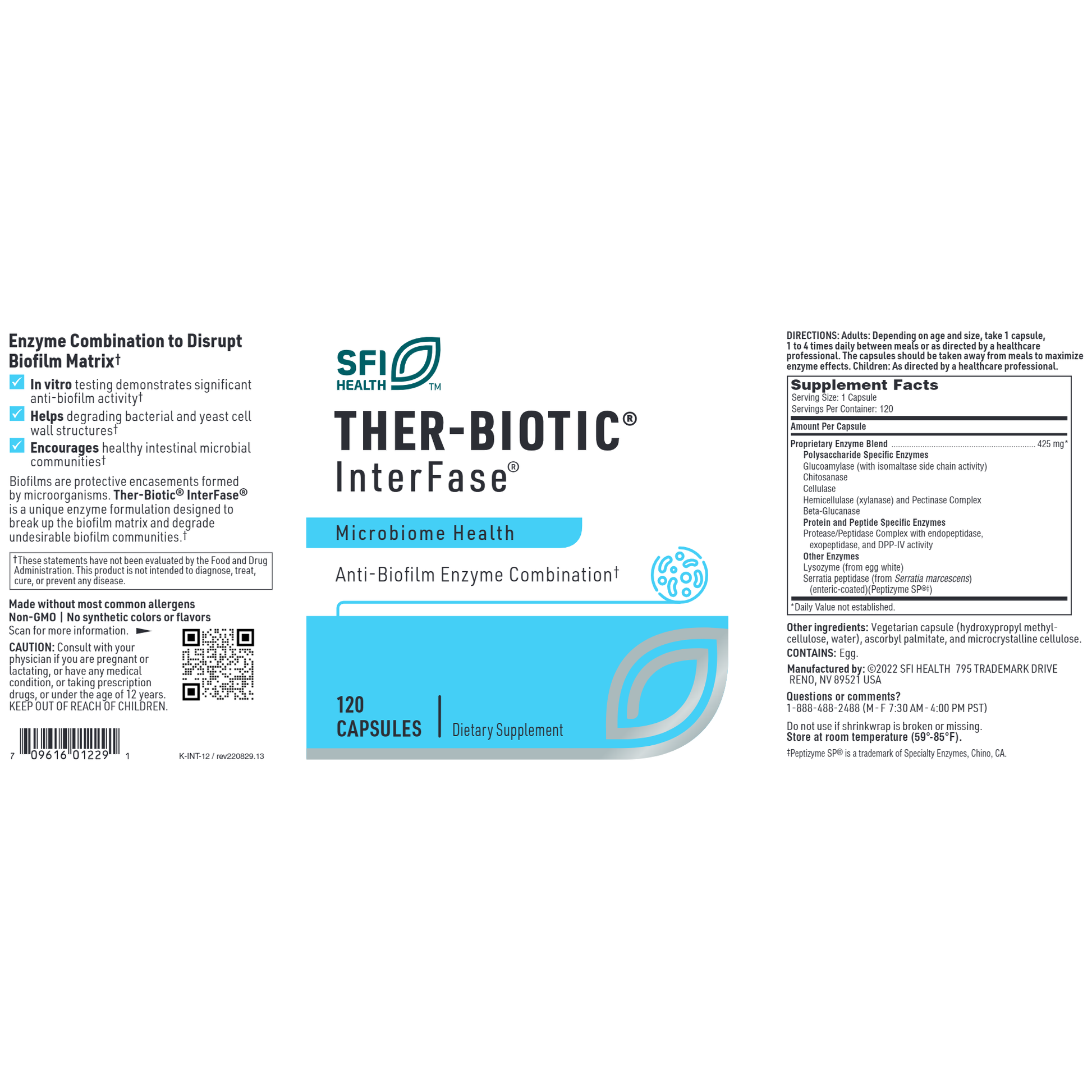 InterFase® is a unique enzyme formulation that is especially designed to disrupt the biofilm matrix that embeds gastrointestinal organisms.* Enzymes in InterFase® are selected for their ability to lyse the extracellular polymers commonly found in biofilm as well as degrade bacterial and yeast cell wall structures.* The enzyme blend in InterFase® was developed using in vitro testing of antibiofilm activity and was found to have significant antibiofilm activity resulting in meaningful degradation of undesirable biofilm communities.* InterFase® is intended for use in conjunction with efforts to support normal gastrointestinal function and microbiota.* As an adjunct, it is best combined with use of a high-strength, broad-spectrum, multispecies probiotic formulation and a prebiotic to encourage the formation of healthy intestinal microbial biofilm communities.*