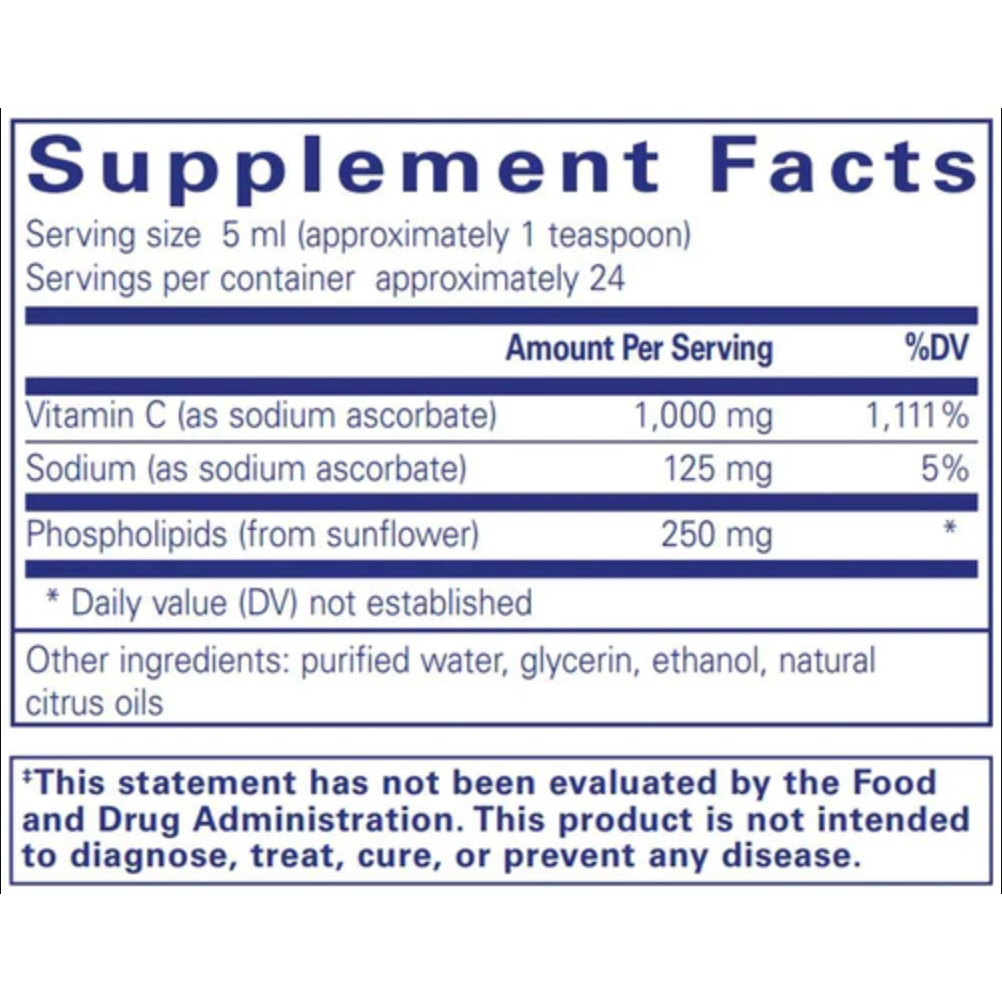 Liposomal Vitamin C liquid offers the antioxidant vitamin C in an enhanced-absorption liposomal form to target cellular health and function, as well as immune defense. This liposomal liquid delivery system utilizes phospholipids from non-GMO sunflower oil and tight manufacturing control to ensure vitamin C encapsulation for optimal performance. The controlled processing procedure results in very small, higher-stable, spherical liposomes. These small-sized liposomes allow for increased diffusion across mucus membranes and absorption.*