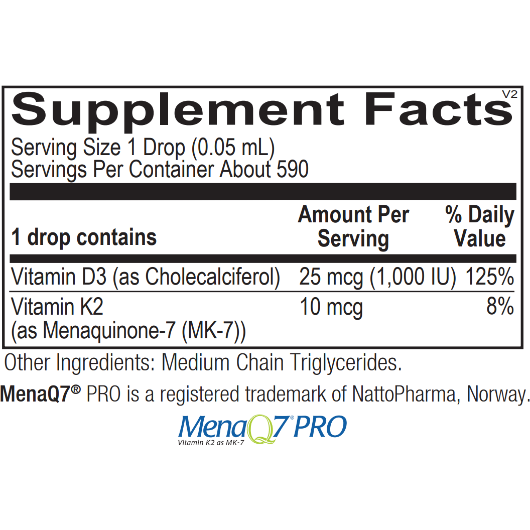 Liquid Vitamin D3 with K2 includes 10 mcg of MenaQ7® PRO, the most widely studied form of vitamin K2 as MK-7, and 1,000 IU of vitamin D3 per serving. The tasteless liquid formula can easily be combined with any beverage.