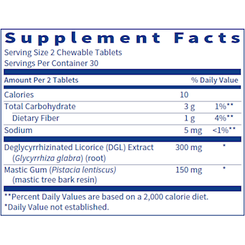 Mastic Gum/DGL is a cinnamon flavored chewable tablet containing DGL (deglycyrrhizinated licorice root and rhizome extract) and mastic gum to support healthy digestion and gastrointestinal function.* This product can help alleviate gastrointestinal discomfort associated with occasional indigestion.*