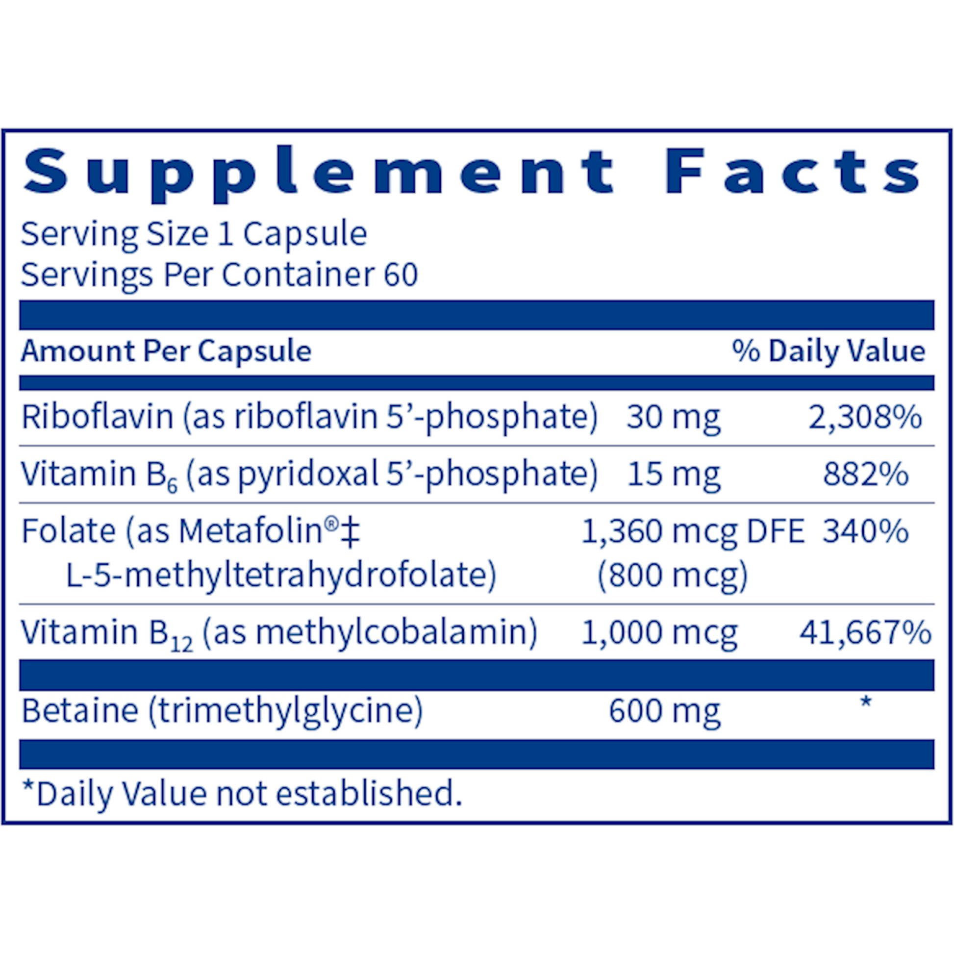 Methyl Balance™ is a unique formula that combines bioactive forms of four essential B vitamins with trimethylglycine (betaine). Vitamins B2, B6, B12, and folate are provided in active, coenzyme forms for maximal bioavailability and function. The ingredients in Methyl Balance™ work together to synergistically support methylation processes and help maintain normal homocysteine metabolism.†