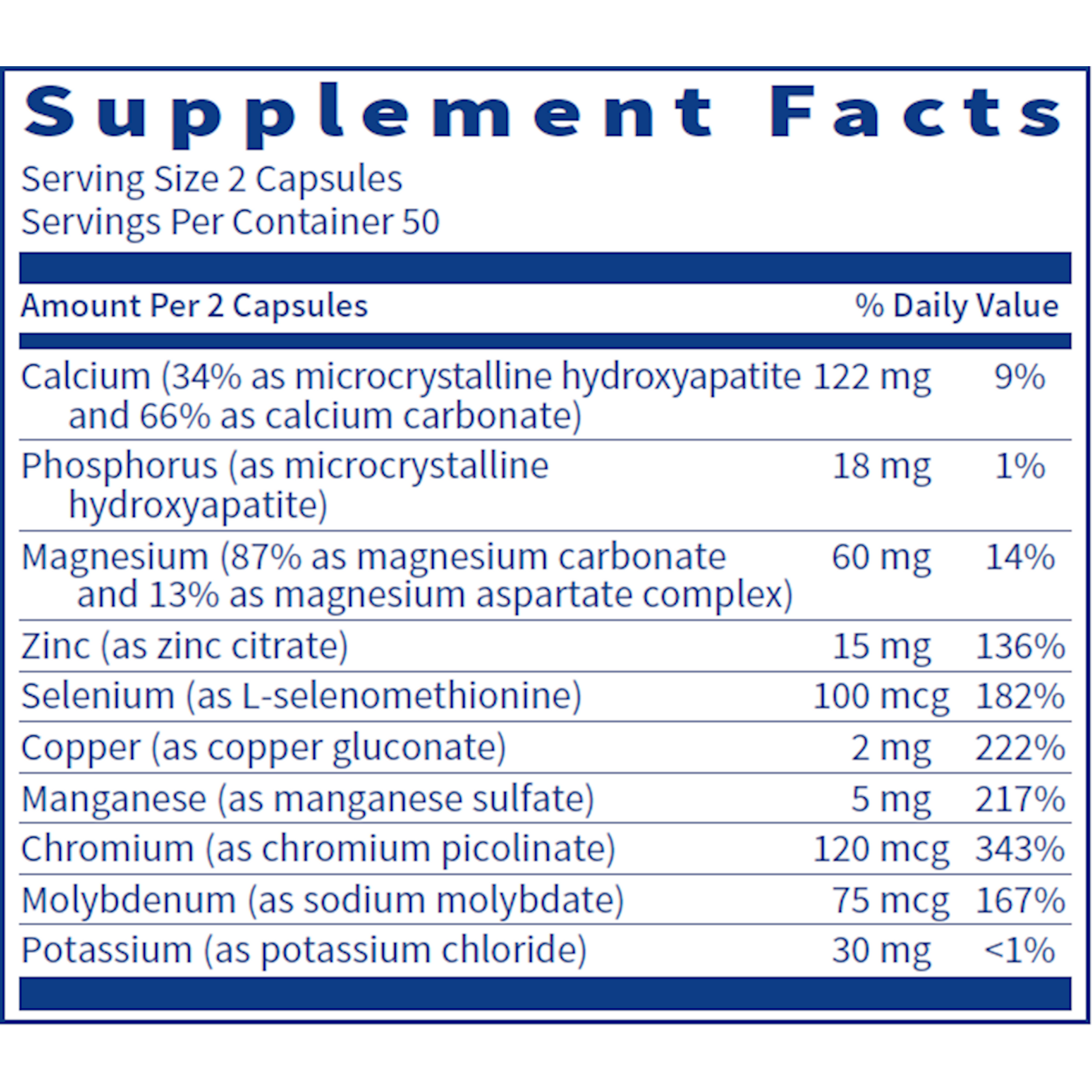 A broad-spectrum, hypoallergenic mineral supplement, Multi-Mineral Complex without Iron has been developed for individuals who do not require iron supplementation. Like Multi-Mineral Complex, this formula provides an array of essential trace elements complemented by small amounts of major minerals (calcium, magnesium, phosphorus, and potassium). Two capsules of Multi-Mineral Complex Without Iron provide 100 percent or more of the Recommended Daily Allowance (RDA) for each trace mineral. For best absorption, Multi-Mineral Complex should be taken with food.