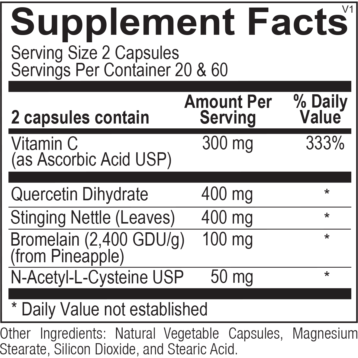Quercetin has strong antioxidant activity and has been shown to support immune health by mediating the release of inflammatory compounds including leukotrienes and prostaglandins. Quercetin is known for its ability to stabilize mast cells, diminishing the release of histamine, the compound known to cause hypersensitivity reactions during seasonal changes.