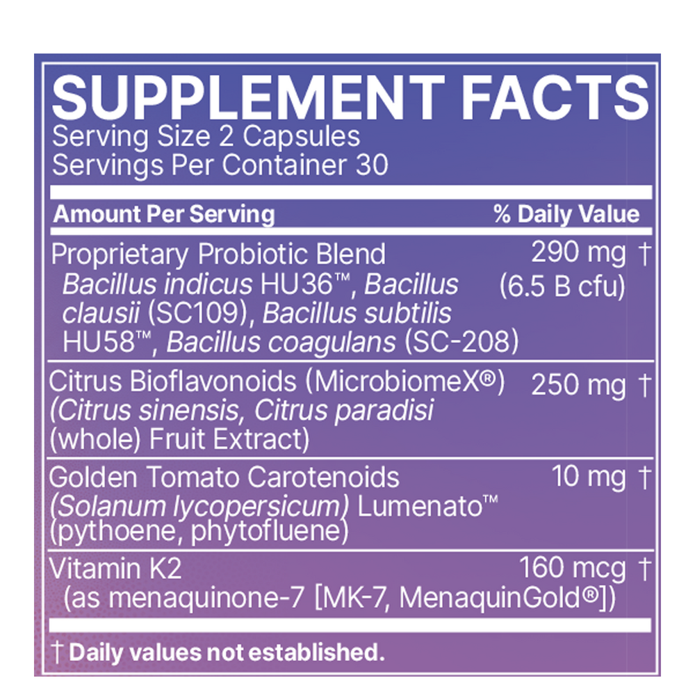 SereneSkin™ is a probiotic-powered skincare supplement that supports a radiant, youthful complexion as well as supporting total body health. SereneSkin™ is a unique blend of four spore-forming Bacillus probiotic strains with added vitamin K2 for overall skin microbiome and gut-skin axis support.